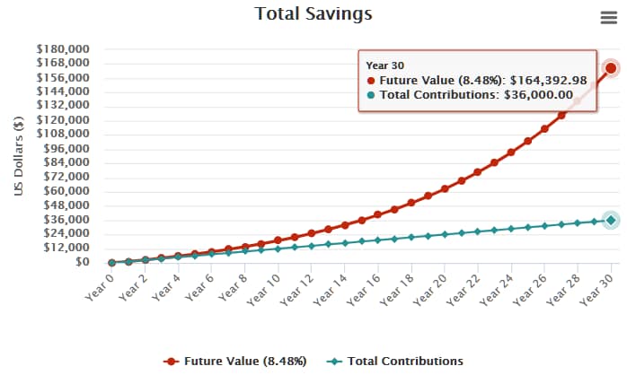 You will have contributed 36000 over a period of 30 years, however, your portfolio is worth a whopping 164.392,98!!. This is truly incredible! You used 36000 of your hard earned money and got 132392 in return for no work! Totally passively!