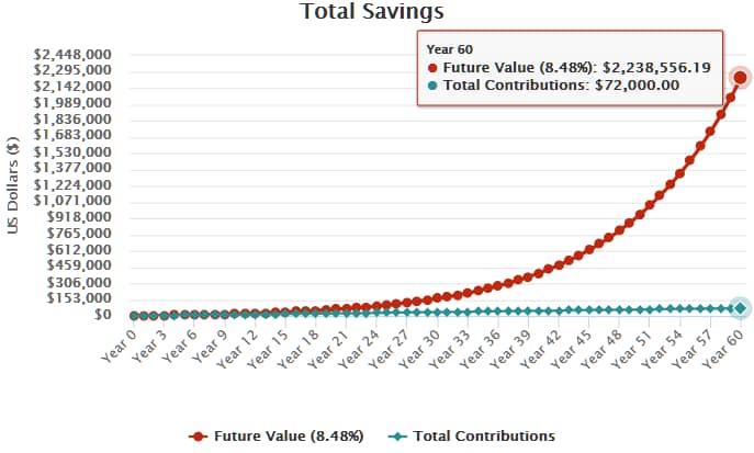 The last scenario using the compound interest calculator. This time we wait 60 years before we look at our portfolio we consistently have deposited 100 into each month! Before we start, here is our assumptions, we have 0 in initial investments, we are investing everything into a broad stock market index funds like VTI (Vanguard Total Stock Market Index Fund), this particular fund have an annual return of 8.48% since inception (It does have a 13.79% return over the last 10 years). For this example let’s use 8.48%. Our period is going to be 60 years! and we still invest 100 each month or 1200 each year.