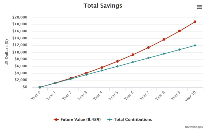 You will have contributed 12000 over a period of 10 years, however, your portfolio would be worth 18,792.72. This is truly amazing already! You used 12000 of your hard earned money and got 6.792 in return for no work! passively!