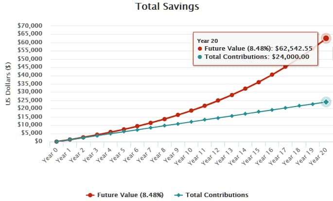 You will have contributed 24000 over a period of 20 years, however, your portfolio is worth 62542,55!. How crazy is that? We only waited 10 more years than previously and got a return of 38.542! Remember we did not work!